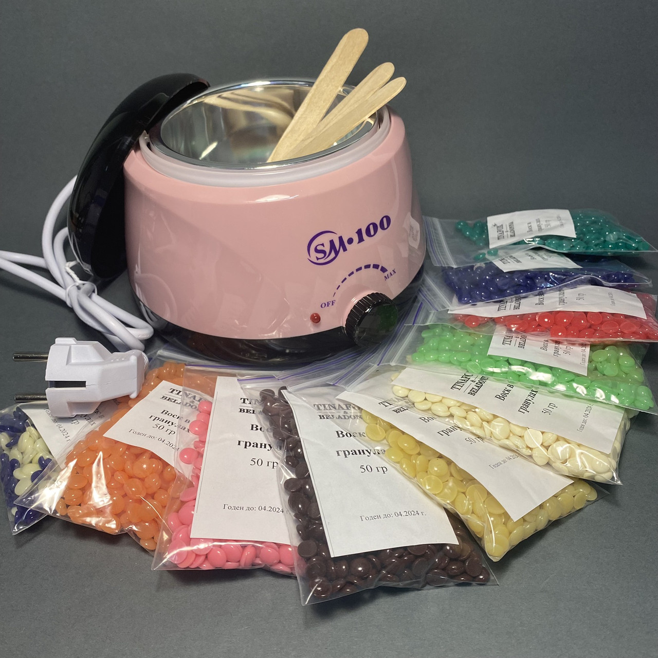 Набір для воскової депіляції 10 восків по 50 г, воскоплав SM-100 рожевий